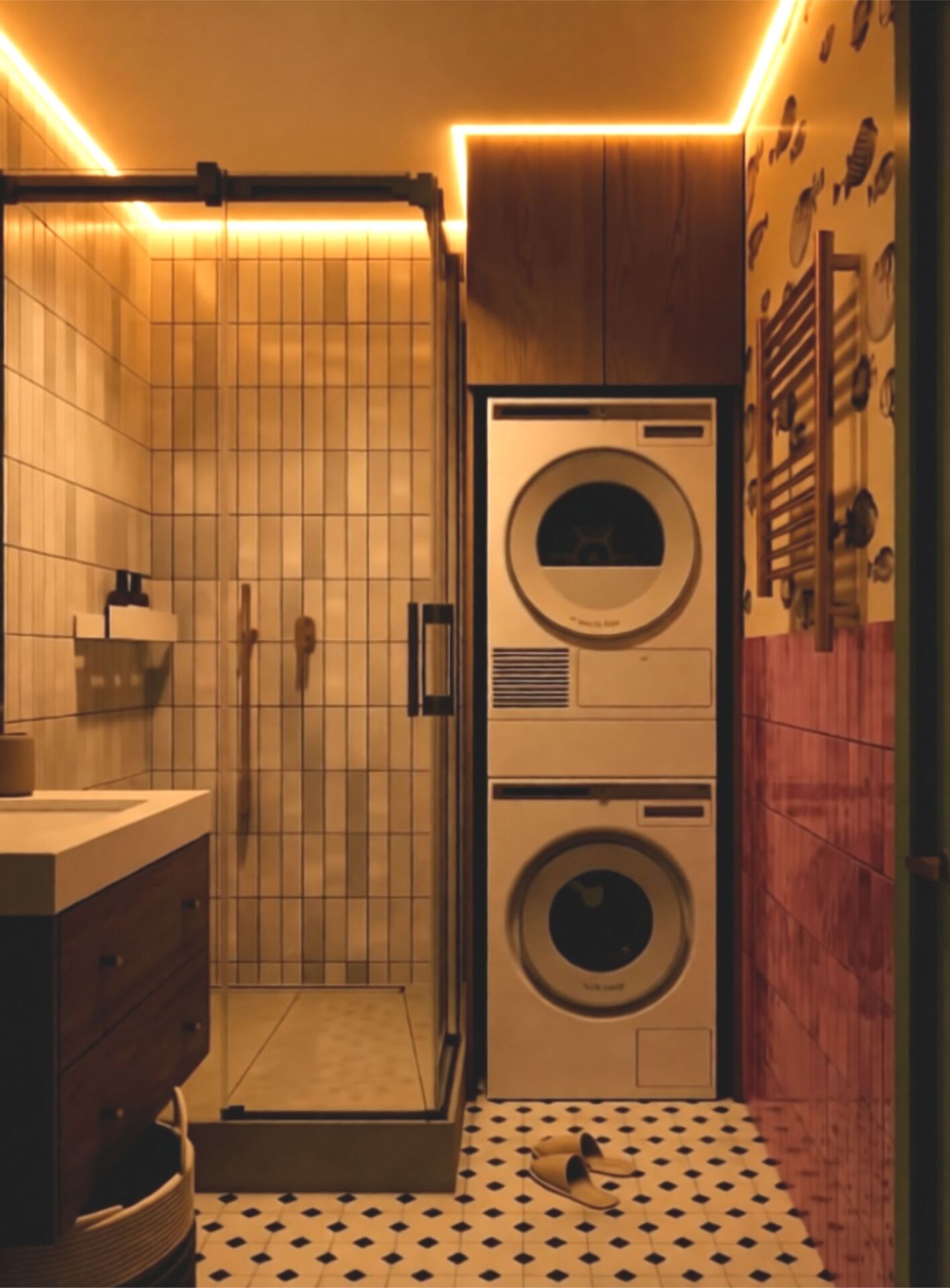Например световой потолок + парящий контур + янтарная подсветка.